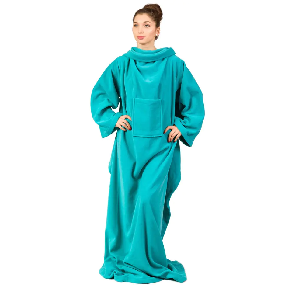 Koc z rękawami i wygodną kieszenią Chłodne jesienno-zimowe wieczory spędzane w domu mogą być bardzo przyjemne pod warunkiem, że zaopatrzysz się w miękki i cieplutki kocyko-szlafrok! Jest to połączenie ciepłego koca z miękkim szlafrokiem, które sprawi, że nie zechcesz ruszyć się z kanapy przez cały wieczór! To wyjątkowe ubranie ma wygodną kieszeń, w której zmieści się pilot do telewizora i kilka innych przydatnych podczas wypoczynku drobiazgów. Do domu i na zewnątrz Nie miej żadnych wyrzutów sumienia – chwila błogiego lenistwa w przyjemnym cieple należy się każdemu! Kocyko-szlafrok sprawdzi się świetnie podczas długich podróży czy na kempingu. Będzie także prawdziwym wybawieniem dla osób cierpiących na przeziębienie lub grypę. Polecamy jako prezent dla osób ciepłolubnych w każdym wieku.