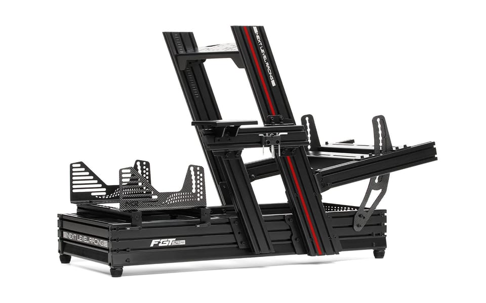 - Wzorcowa w branży konstrukcja wytłaczanego aluminium z niestandardowymi zaślepkami końcowymi i nakrętkami T-Slot Next Level Racing, suwakami siedziska Next Level Racing Flex-Free i niestandardowymi śrubami barkowymi Next Level Racing.