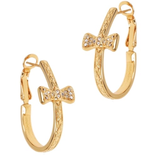 Kolczyk w formie owalu z kokardką i kryształkiem Swarovsky. Długość 3cm, szerokość 1,2cm. Kolczyki pozłacane.