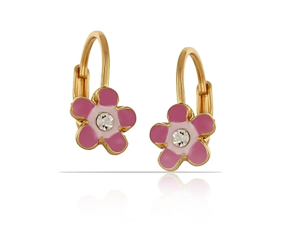 Pozłacane, ręcznie malowane na różowo kolczyki kwiatuszki, zdobione kryształkami Preciosa. Długość kolczyka ok 1,8 cm.