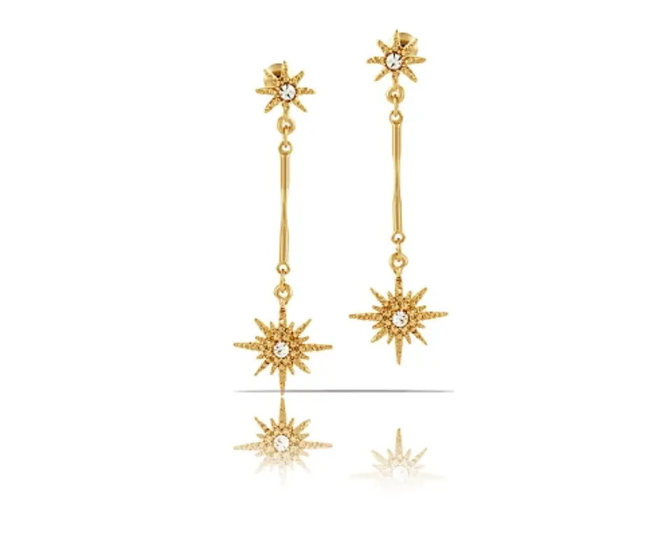 Pozłacane kolczyki śnieżynki z kryształkami Preciosa. Długość kolczyka wynosi 5,5cm, szerokość 1,6cm.