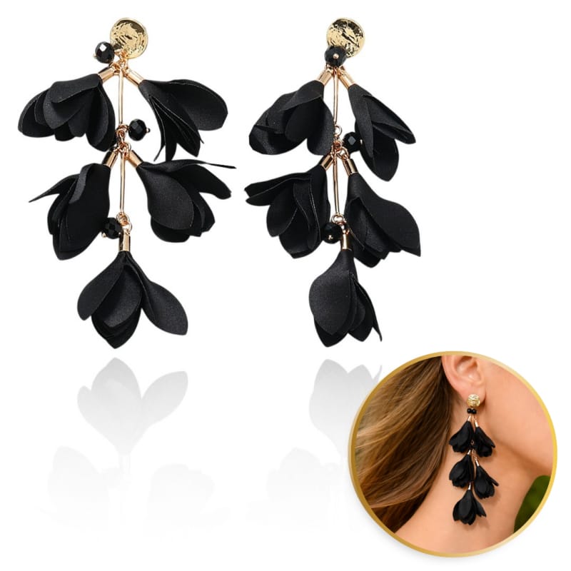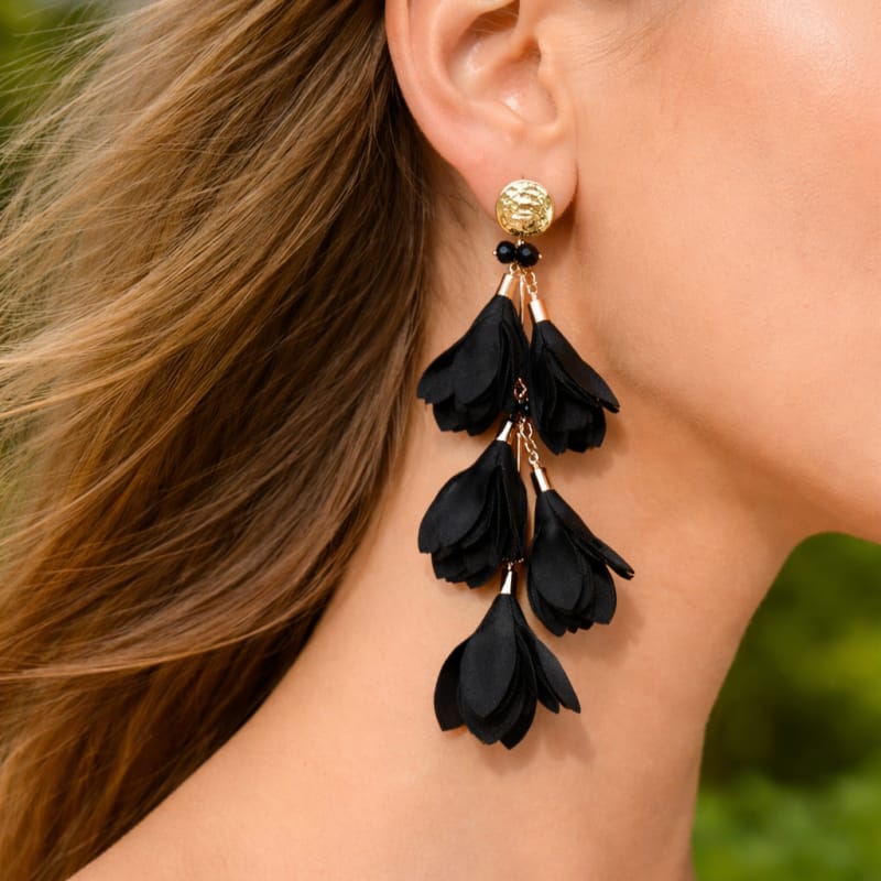 Kolczyki wiszące, efektowne tiulowe kwiat, czarne K1706