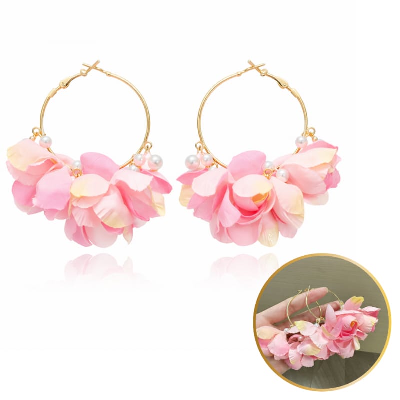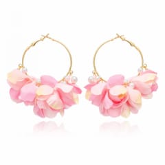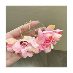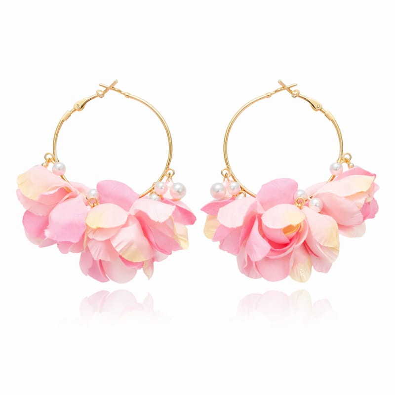 Kolczyki wiszące KOŁA, efektowne tiulowe, różowe kwiaty, perełki K1732
