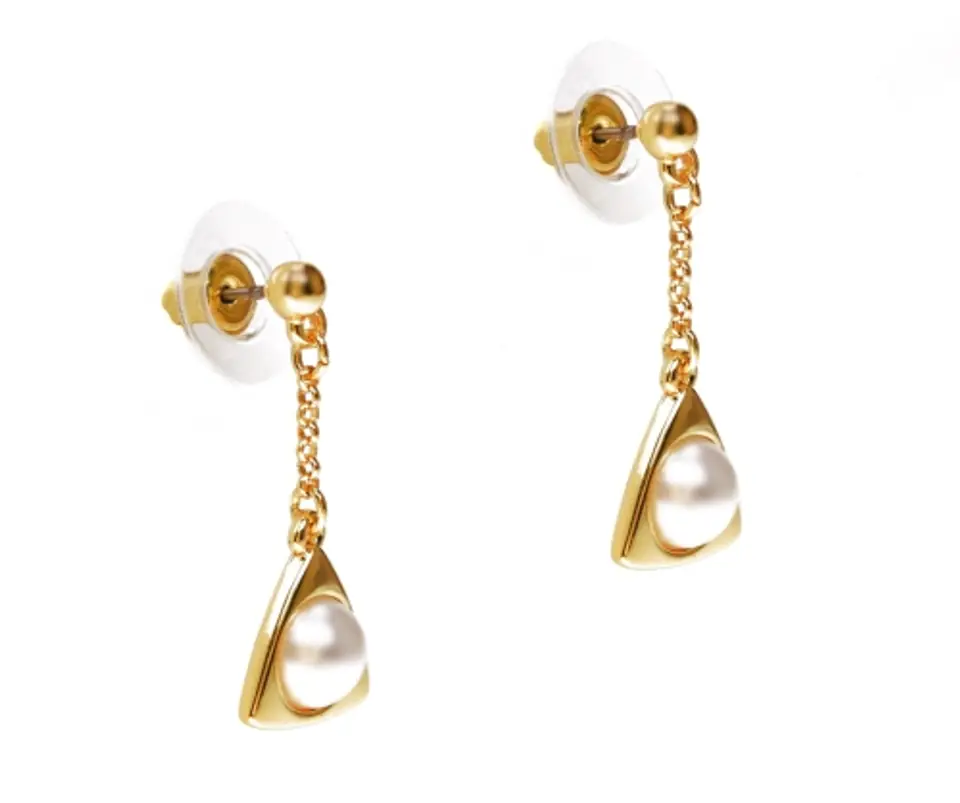 Wiszące kolczyki z perełką łączą perełkę z nowoczesnym wzorem. Długość 2,9cm, szerokość 1,1cm. Kolczyki pozłacane.