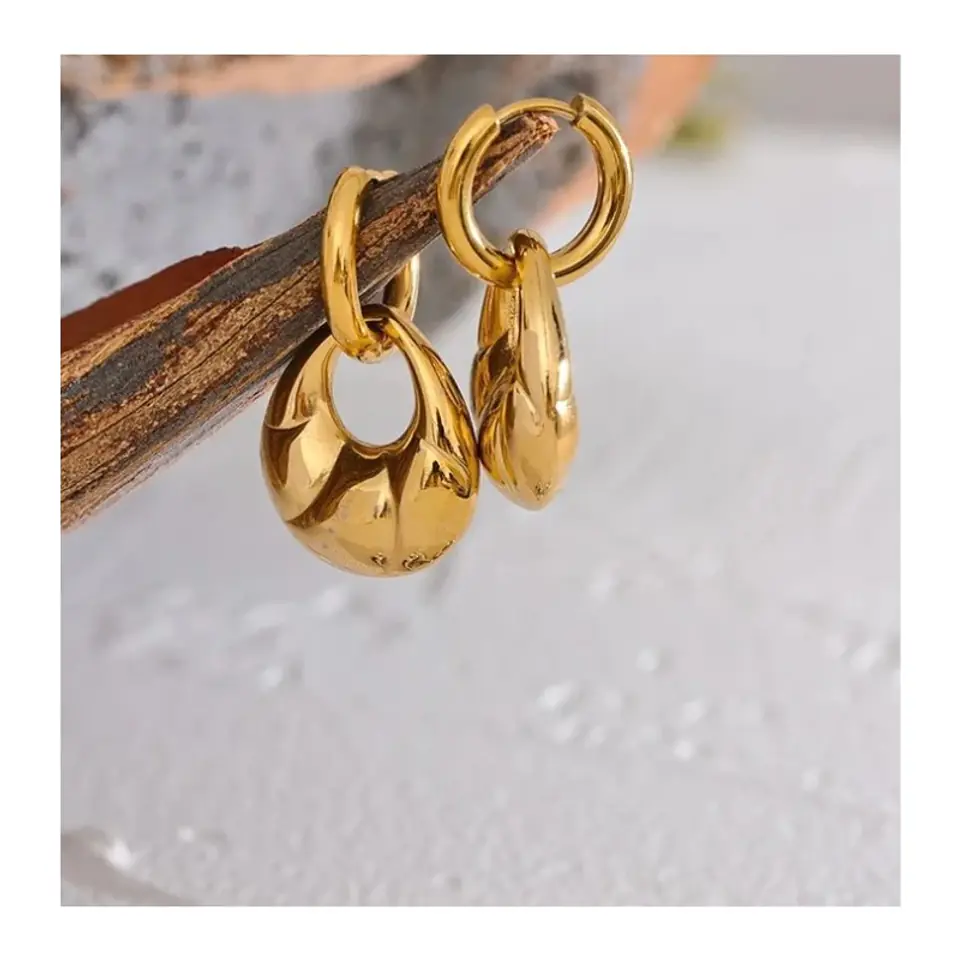 Kolczyki ze stali chirurgicznej platerowanej 14 karatowym złotem Eleganckie i stylowe kolczyki. WYMIARY:1,8 x 3 cm Kolor: jasne złotoRodzaj zapięcia: angielskieProducent: innyWaga: 7g STAL CHIRURGICZNA jest odporna na warunki atmosferyczne, nieulega korozji, nie rdzewieje, nie śniedzieje.