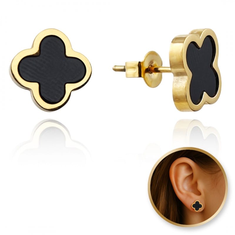 Kolczyki ze stali szlachetnej platerowane 14k złotem, sztyft, Koniczynka czarna KST3419