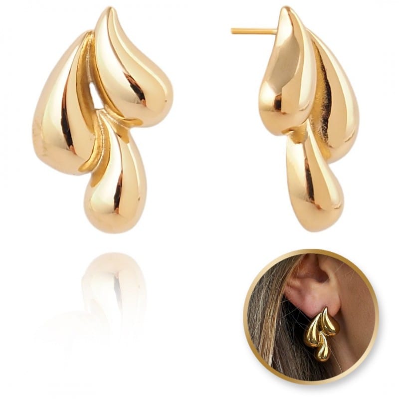 Kolczyki ze stali szlachetnej platerowane 14-karatowym złotem, sztyft Eleganckie i stylowe kolczyki. WYMIARY:Wymiar kolczyków: 3 cm x 1,9 cm Wymiar kartonika:5,5 cm x 6 cm Waga:10g netto / 12g brutto Kolor: jasne złotoRodzaj zapięcia: sztyft STAL CHIRURGICZNA jest odporna na warunki atmosferyczne, nie ulega korozji, nie rdzewieje, nie śniedzieje.
