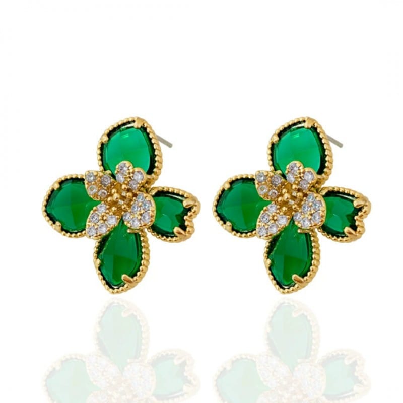 Kolczyki ze stali szlachetnej pozłacane 14k złotem, cyrkonie zielone kwiaty KST3472