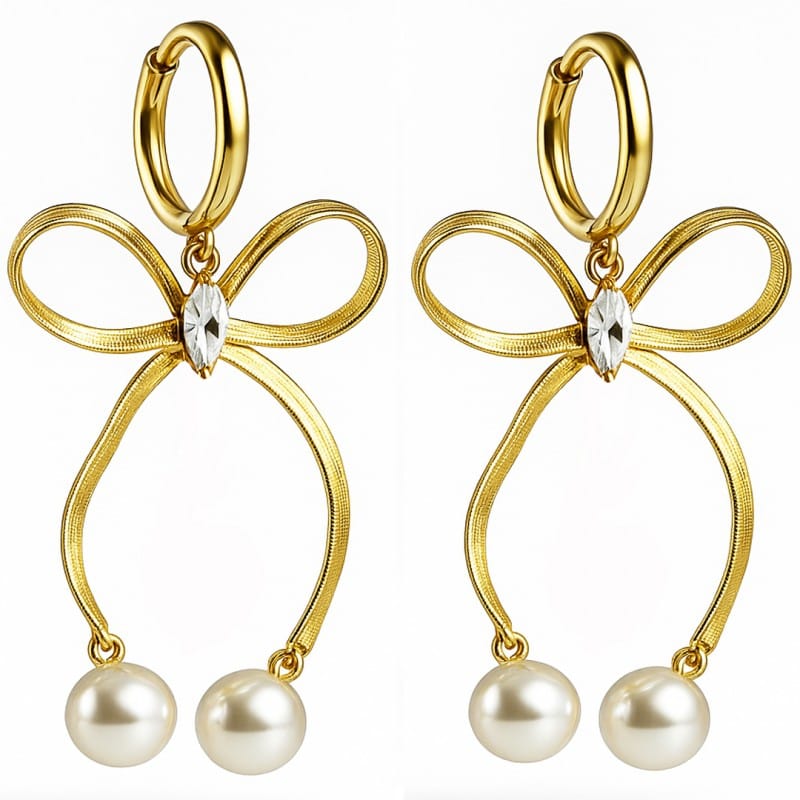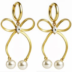 Kolczyki ze stali szlachetnej pozłacane 14k złotem, wiszące kokardy z perełkami KST3453