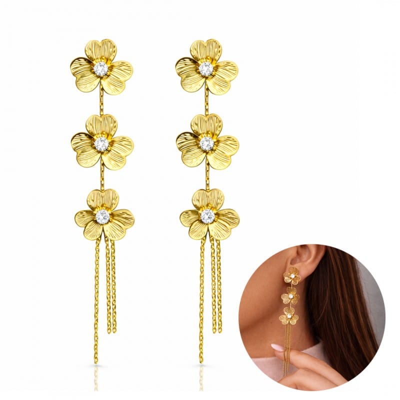 Kolczyki ze stali szlachetnej pozłacane 14k złotem, wiszące kwiaty z cyrkoniami KST3509