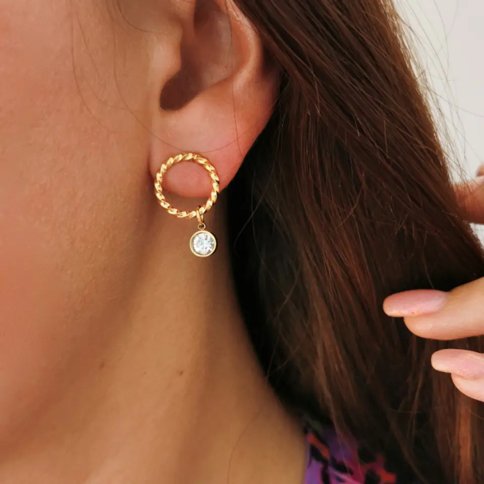 Kolczyki ze stali chirurgicznej platerowanej 14 karatowym złotem Eleganckie i stylowe kolczyki. Kolor: Jasne złoto Wymiary:Długość: 2 cmśrednica kółka 1,4 cm Rodzaj zapięcia: sztyft STAL CHIRURGICZNA jest odporna na warunki atmosferyczne, nie ulega korozji, nie rdzewieje, nie śniedzieje.