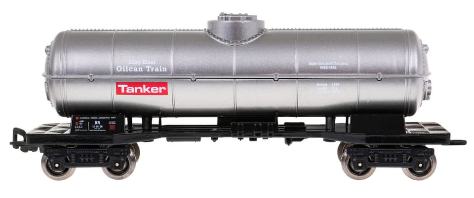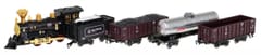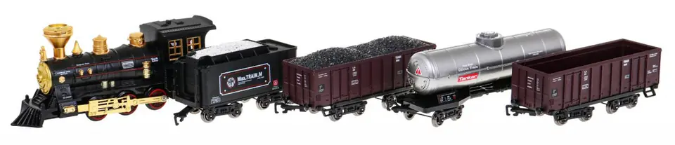 | - lokomotywa, - 3 wagony towarowe, - wagon cysterna, - części składowe toru, - pipetka na wodę. |
