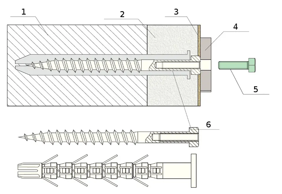 Wkręt z gwintem wewnętrznym umożliwia montaż ciężkich elementów na elewacji budynków ocieplonej styropianem (np. kamer, lamp, itp.)