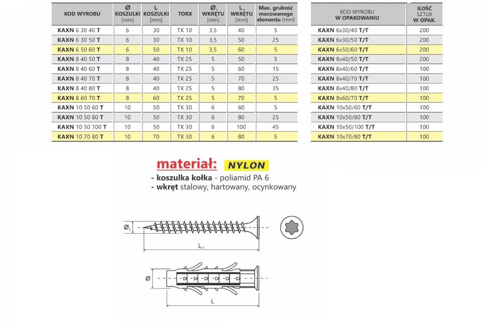 Kołek rozporowy wszechstronnego zastosowania z wkrętem z gniazdem torx TX25 ,