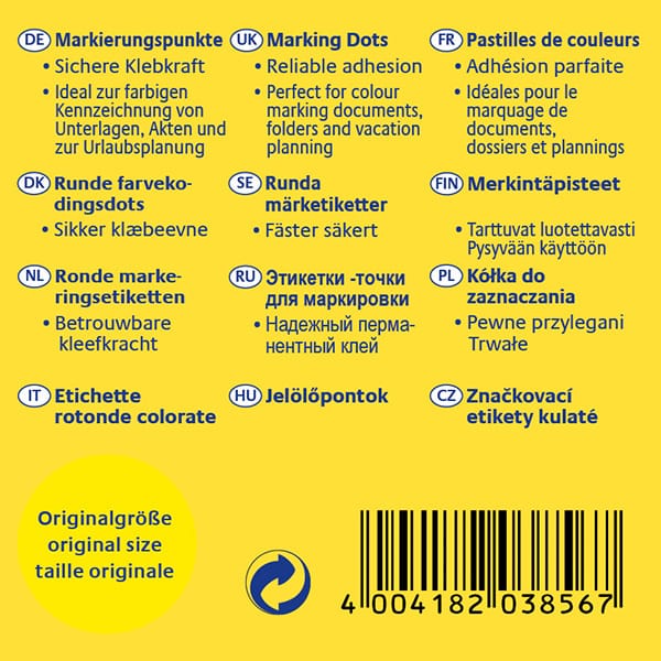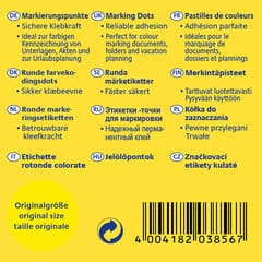 * KÓŁKA DO ZAZNACZANIA W DYSPENSERACH * W poręcznej formie dyspensera * Pewnie przylegają * Odpowiednie do wszechstronnej aplikacji * Ułatwiają organizację tematyczną różnymi kolorami * W 4 popularnych kolorach do wyboru: różowe, zielone, żółte, lub niebieskie * Dostępne w dwóch wymiarach do wyboru: 10mm lub 19mm * Pakowanie: 10 op. na tacce zbiorczej * Kolor: zielone * Rozmiar: O19 mm * Liczba etykiet w opakowaniu: 250 * Klej: trwałe * Producent: Avery Zweckform