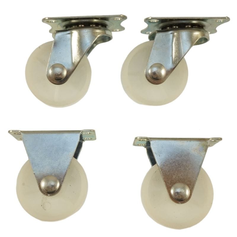 - Komplet czterech nylonowych kółek do mebli, w tym dwa kółka skrętne.