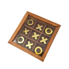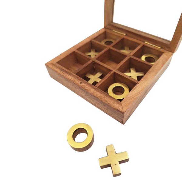 Kółko i krzyżyk w pudełku ze szklanym topem - DNU-004 Kółko i krzyżyk w pudełku to elegancka wersja klasycznej gry strategicznej z ostatnich stron zeszytów. Klocki wykonane z drewna z mosiężnymi zdobieniami. Drewniane pudełko z przegródkami na kółka i krzyżyki jest jednocześnie planszą gry. Top pudełka jest szklany. Kółko i krzyżyk w tej odsłonie będzie się świetnie prezentować na biurku. Drewno w połączeniu z mosiądzem dodaje zestawowi luksusowego wyglądu. Kółko i krzyżyk sprawdzi się jako zabawny prezent dla dyrektorki szkoły, nauczycielki lub prezesa. Klocki oraz pudełko zostały wykonane z drewna, a mosiężne zdobienia dodają im elegancji. Pudełko posiada szklany top, co nadaje mu luksusowego wyglądu. Drewniane pudełko zamykane, z przegródkami na klocki, pełni jednocześnie funkcję planszy do gry, co ułatwia przechowywanie i transport. Połączenie drewna z mosiądzem sprawia, że zestaw idealnie wkomponuje się w wystrój gabinetu, biura czy salonu, dodając mu stylowego charakteru. Informacje o produkcie: ·Materiał: drewno, mosiądz, szkło ·Wymiary pudełka: 12,5 x 12,5 x 2,5cm ·Pudełko zamykane - Top szklany ·Kółka i krzyżyki wykonane z drewna z mosiężnymi zdobieniami Uwaga! Niniejszy produkt nie jest zabawką. Produkt przeznaczony dla osób powyżej 14 roku życia.