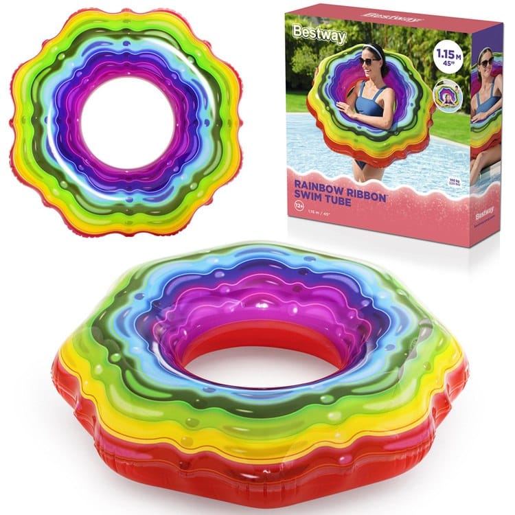 Dmuchane koło do pływania Bestway zyskało radosny design w tęczowych barwach. Duże koło doskonale sprawdzi się podczas nauki pływania oraz jako wygodne siedzisko, unoszące się na wodzie. Żywe kolory układające się w wielobarwną tęczę. Mocne PVC odporne na działanie słonej wody i promieni słonecznych. Szczelny zawór.