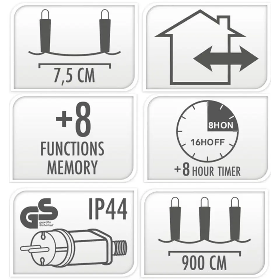 Funkcja timera sprawi, że po jego aktywacji łańcuch powtarzalnie świeci przez 8 godzin, a następnie wyłącza się na 16 godzin. Można go w każdej chwili zresetować przytrzymując przycisk na wtyczce przez parę sekund (zielone światełko timer działa).