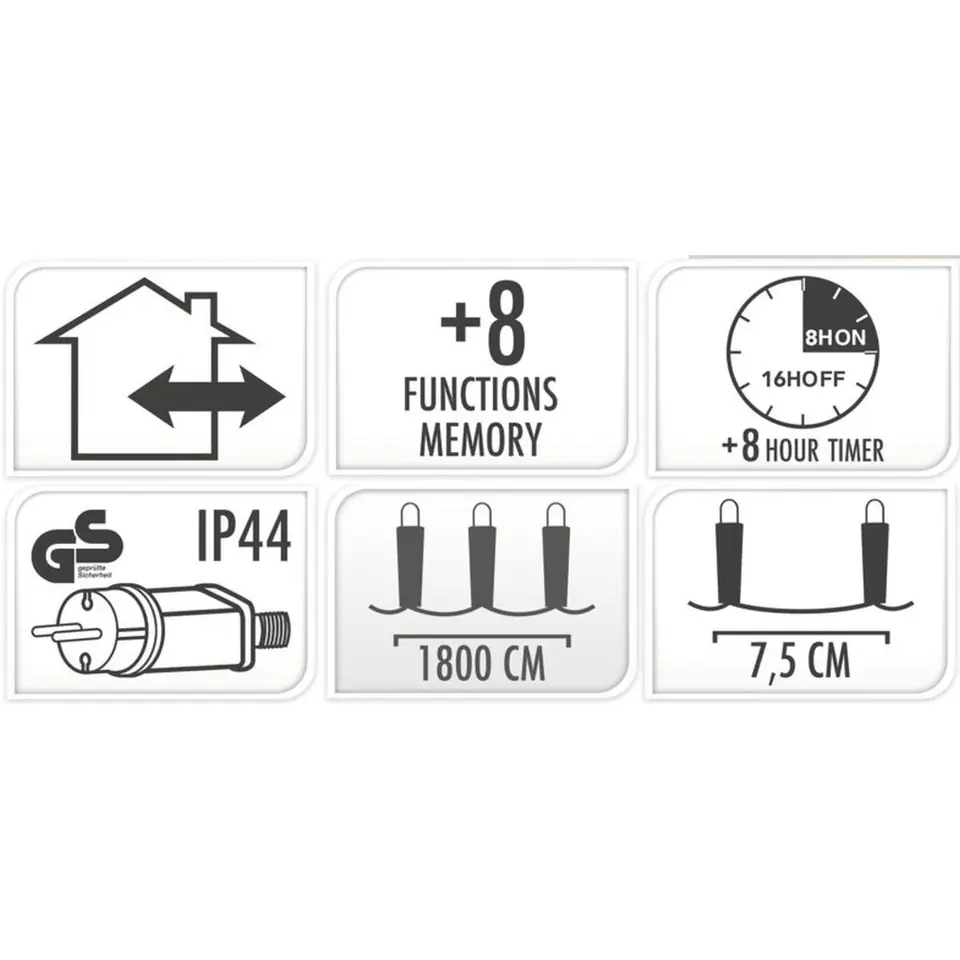 - 240 białych diod LED pięknie oświetli każdą choinkę, dom, okno czy witrynę sklepowąwykonane z wysokiej jakości materiałów są źródłem ciepłego białego światłamogą być używane zarówno wewnątrz jak i na zewnątrz pomieszczeńdziałają znacznie dłużej od tradycyjnych lampek, nie nagrzewają się i zużywają mniej prądu posiadają 8 trybów świecenia do wyborufunkcja timera, rozświetli drzewko w regularnych odstępach czasu bez potrzeby włączania i wyłączaniaposiadają certyfikat CE