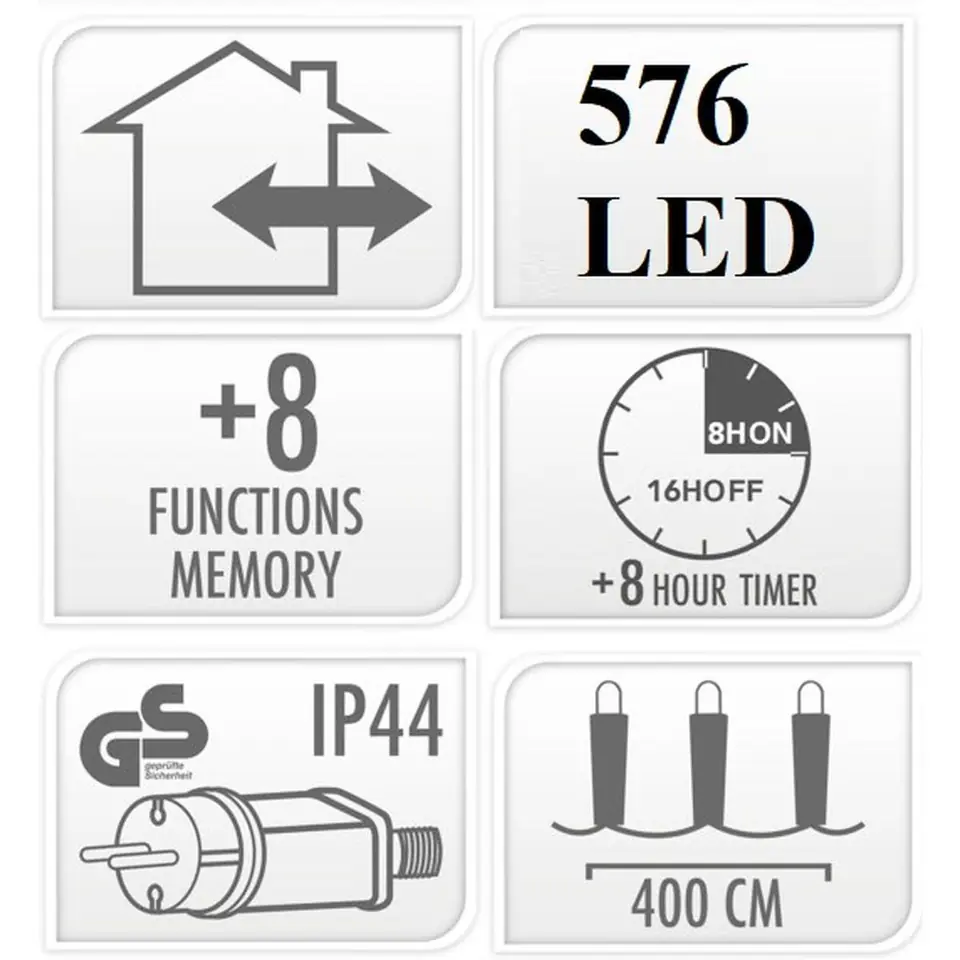 Ten łańcuch świelny ma aż 576 gęsto ułożnych bo, co 5,5 mm diod LED, dzięki temu gwarantuje wspaniały efekt świetlny, który na pewno przyciągnie wzrok i sprawi, że wokół zapanuje wspaniały, świąteczny klimat.