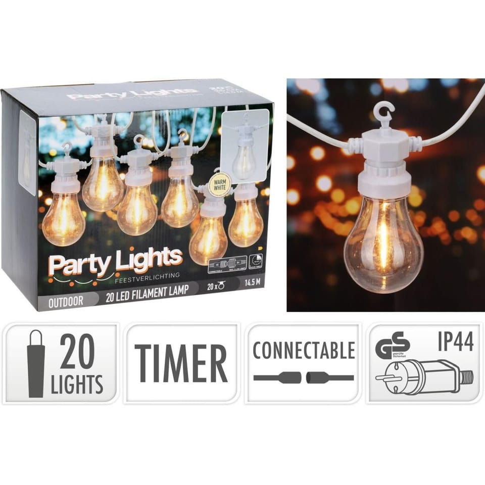 - składa się z 20 żarówek z diodami LEDdługa na 9,5 m - idealna do oświetlenia nawet większej przestrzeniwbudowany timer zapewnia automatyczne włączanie i wyłączanie lampekświatło LED – stworzy przytulną atmosferę i podkreśla charakter otoczeniakażda lampka posiada haczyk ułatwiający zawieszaniezasilacz o odporności IP44 sprawia, że nadaje się do użytku na zewnątrzłatwe w montażu – wystarczy podłączyć i zawiesić w wybranym miejscuzasilanie sieciowe zapewnia brak konieczności wymiany baterii