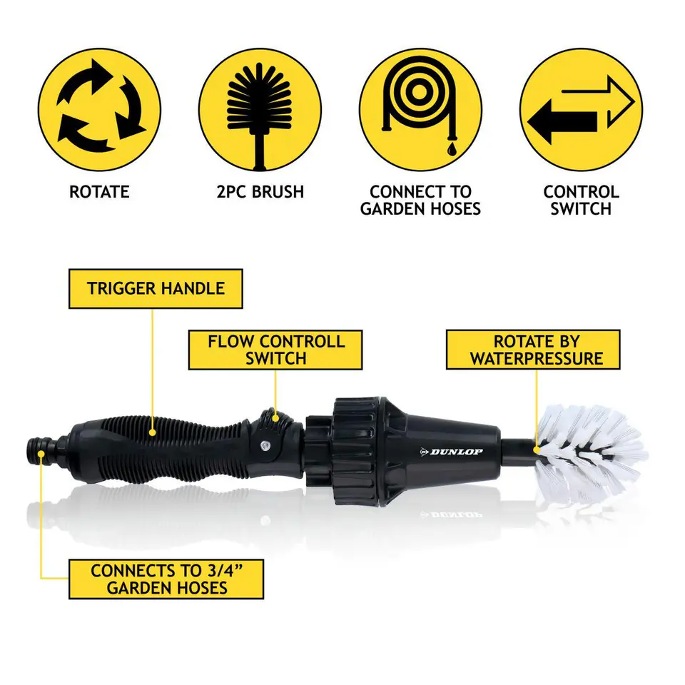 Szukasz odpowiedniego asortymentu, by szybko i sprawnie wyczyścić felgi i różne elementy samochodu lub roweru? SZCZOTKA DO MYCIA FELG OBROTOWA DUNLOP DŁ. 36,5CM podłączana do węża ogrodowego Ci w tym pomoże!