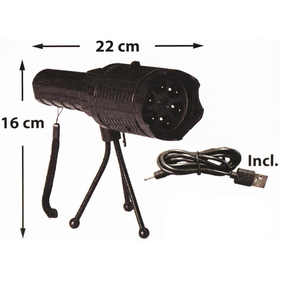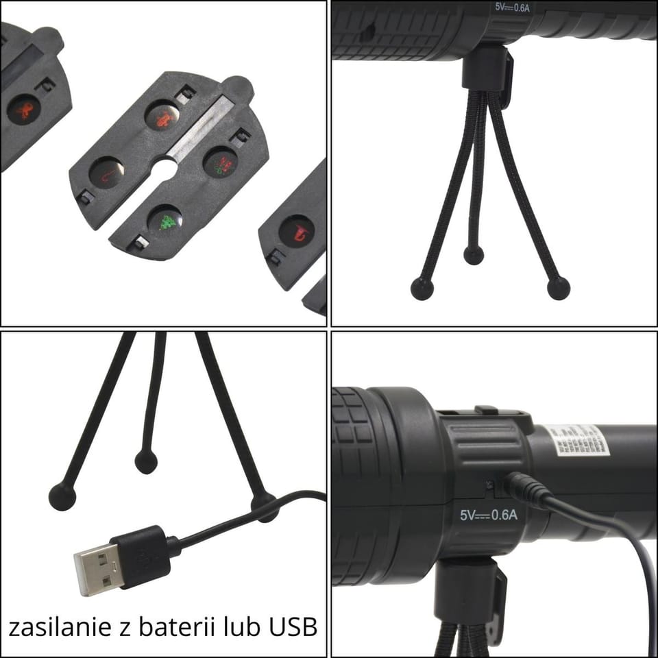- wyposażony w 4 wymienne folie projekcyjne z różnymi wzoramibezpieczny i energooszczędny – tylko do użytku wewnętrznegolekki, kompaktowy design – łatwy do ustawienia w dowolnym miejscudwa sposoby zasilania – 3 baterie AAA (brak w zestawie) lub kabel USB (w zestawie, 100 cm)idealny na święta, przyjęcia i dekoracje pokoju dziecięcego