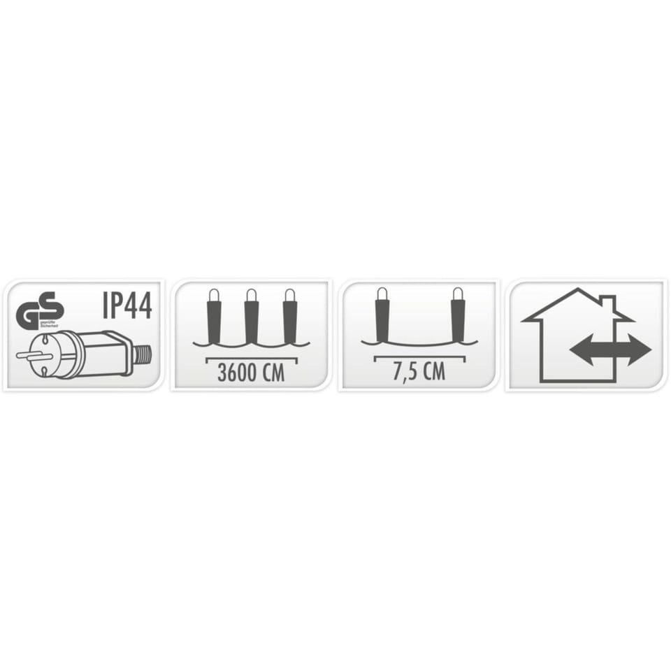- 480 energooszczędnych diod LED w ciepłej bielitransparentny przewód pozwala na dyskretne prowadzenie świateł36 m części z lampkami, idealnie na dużą powierzchnięstopień ochrony IP44 oferuje bezpieczne użytkowanie na zewnątrzgęsty rozstaw lampek co 7,5 cm zapewnia ciekawy efekt świetlny