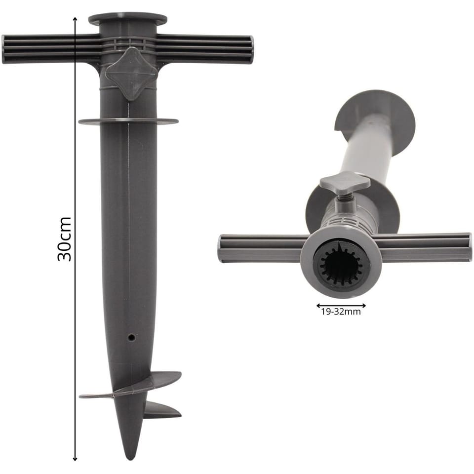 - prosta w montażuodporna na rdze i zmienne warunki atmosferycznespecjalne pokrętło pozwoli dopasować bazę do średnicy parasola od ok. 19 – 32 mmśrubowy szpikulec pozwoli mocno zakotwiczyć mocowanie w piaskuwygodne uchwyty po obu stronach ułatwia wkręcanie