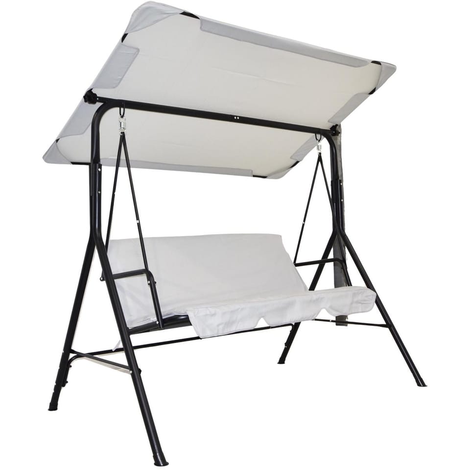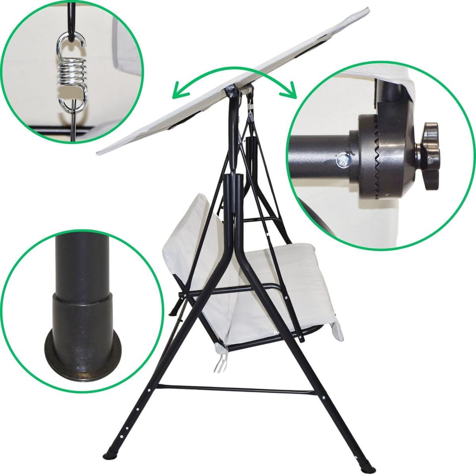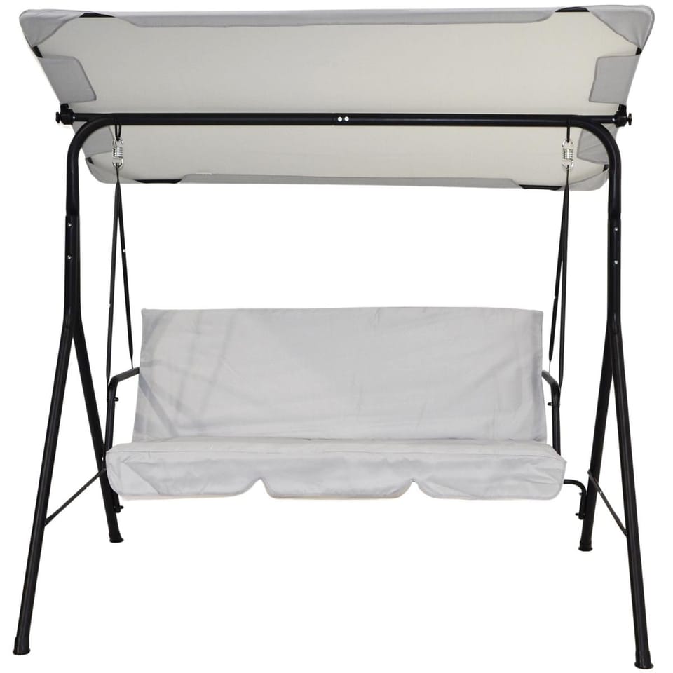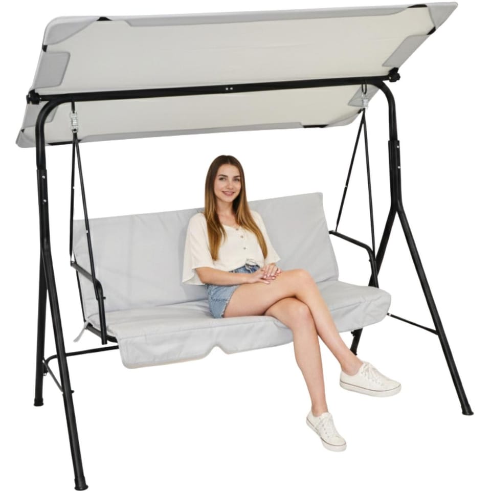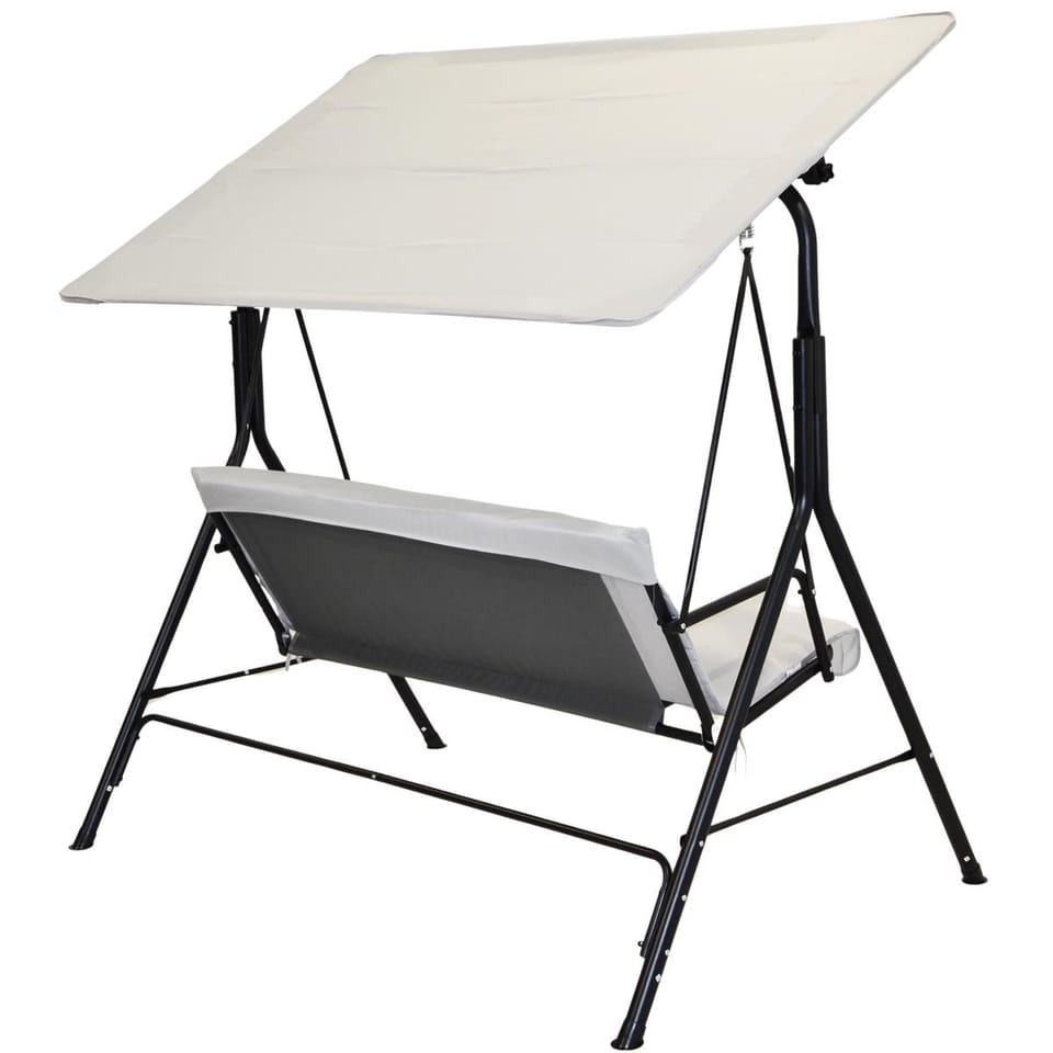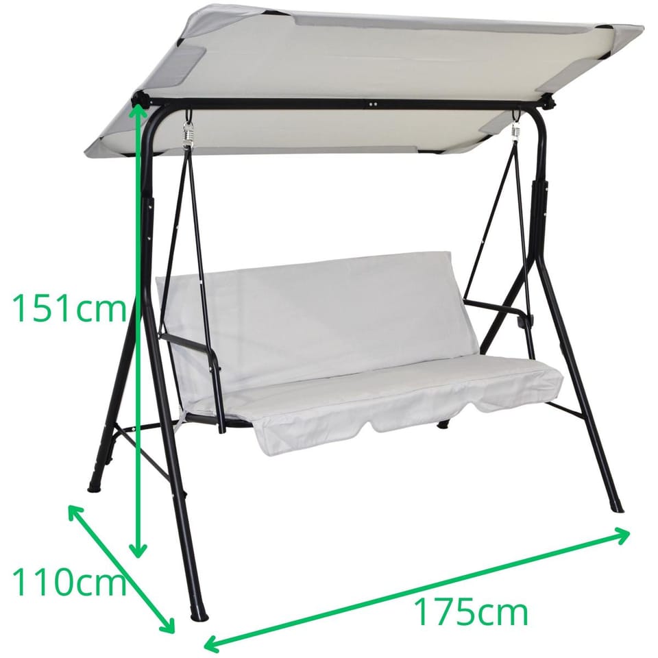 Parametry:- Wymiary ok.: 170x110x151cmLiczba miejsc: 3Wysokość siedziska: 52cmKonstrukcja: stalowe rury O 38 × 0,8 mm / O 25 × 1 mmWykończenie ramy: malowanie proszkowe, kolor czarnyMateriał siedziska i oparcia: Oxford poliester 230 g/m2, kolor jasnoszaryMateriał daszka: poliester 140 g/m2Maksymalne obciażenie: 300 kgKolor: szary / czarnyMarka: PROGARDEN