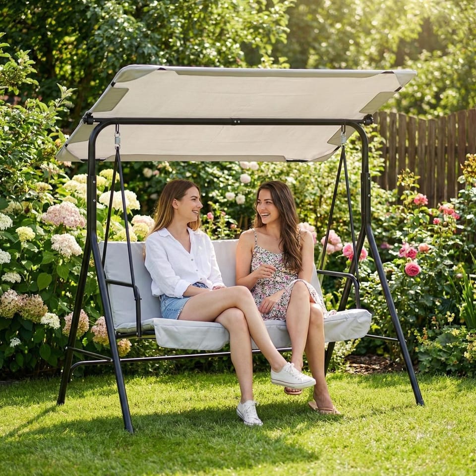 Zrelaksuj się w dobrym stylu i ciesz się chwilą spokoju na świeżym powietrzu – ta 3-osobowa huśtawka z daszkiem to idealne miejsce na codzienny odpoczynek
