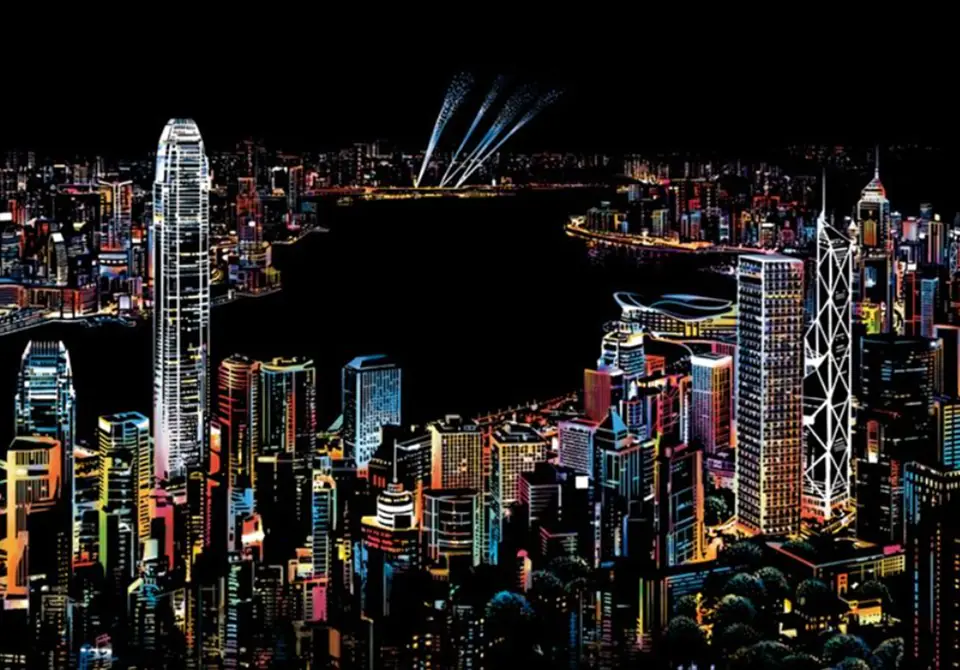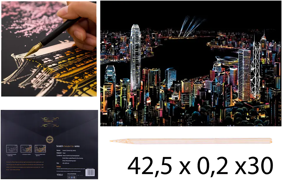 Zdrapywanka, to czarny arkusz, który pod spodem kryje piękny obraz. W tej ofercie znajdziecie Państwo piękny widok nocnego miasta Hong-Kong. Zdrap cały obraz i odkryj piękno widoku miasta.