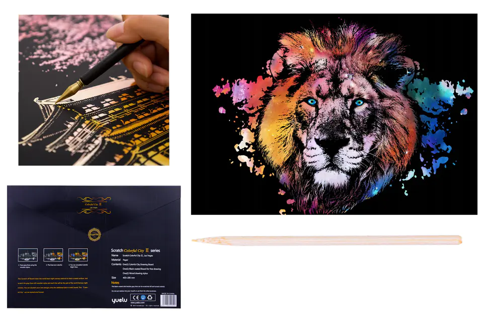 Przedstawiamy niesamowitą MAGICZNĄ ZDRAPYWANKĘ prezentującą . Za swoją czarną powierzchnią zdrapka ukrywa najlepszą nocną scenerię na świecie. Wystarczy zdrapać szare linie drewnianym rysikiem, a każda linia stanie się kolorową częścią niesamowitej nocnej scenerii.