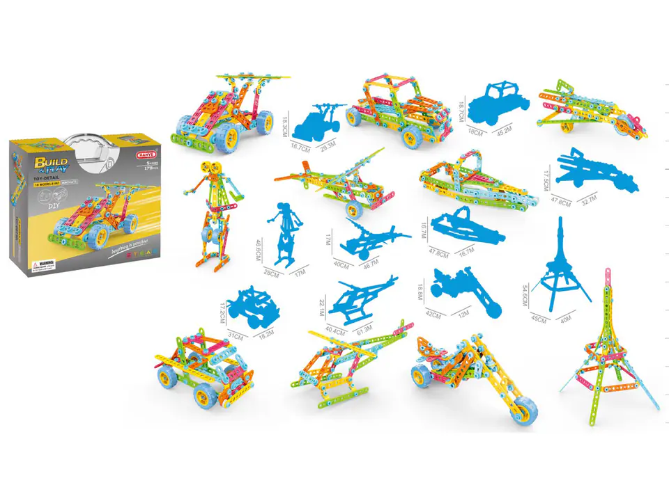 Kolorowe Klocki Konstrukcyjne 179 El. Pojazdy, Wieża, Motocykl, Auto, Odrzutowiec, Samolot Do Rozkręcania I Skręcania 10w1