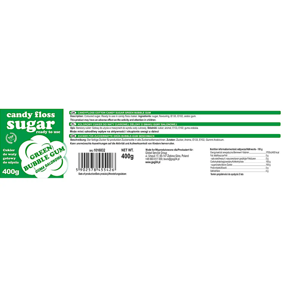 Kod producenta: 1016832Kolorowy cukier do waty cukrowej zielony o smaku gumy balonowej. Barwiony i aromatyzowany cukier. Gotowy do użycia w maszynach do wyrobu waty z cukru. Najwyższa jakość - 20 LAT DOŚWIADCZENIA w produkcji waty cukrowej oraz kolorowego cukru do waty.Cechy produktu: