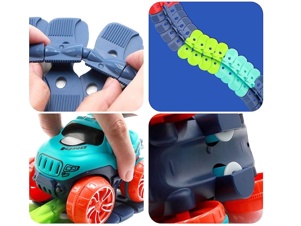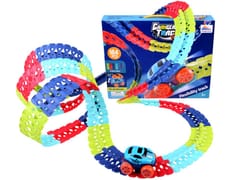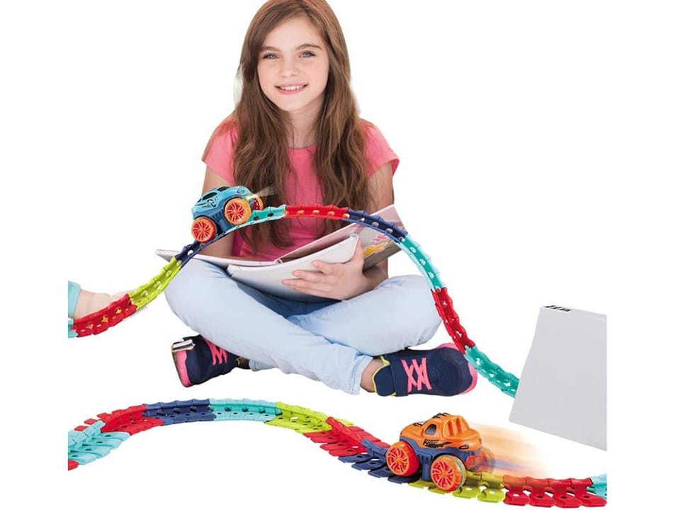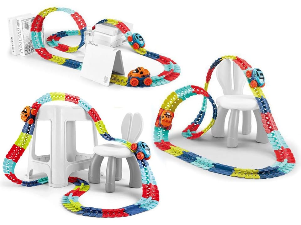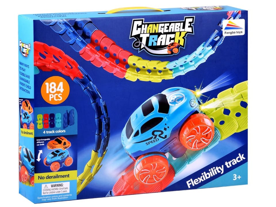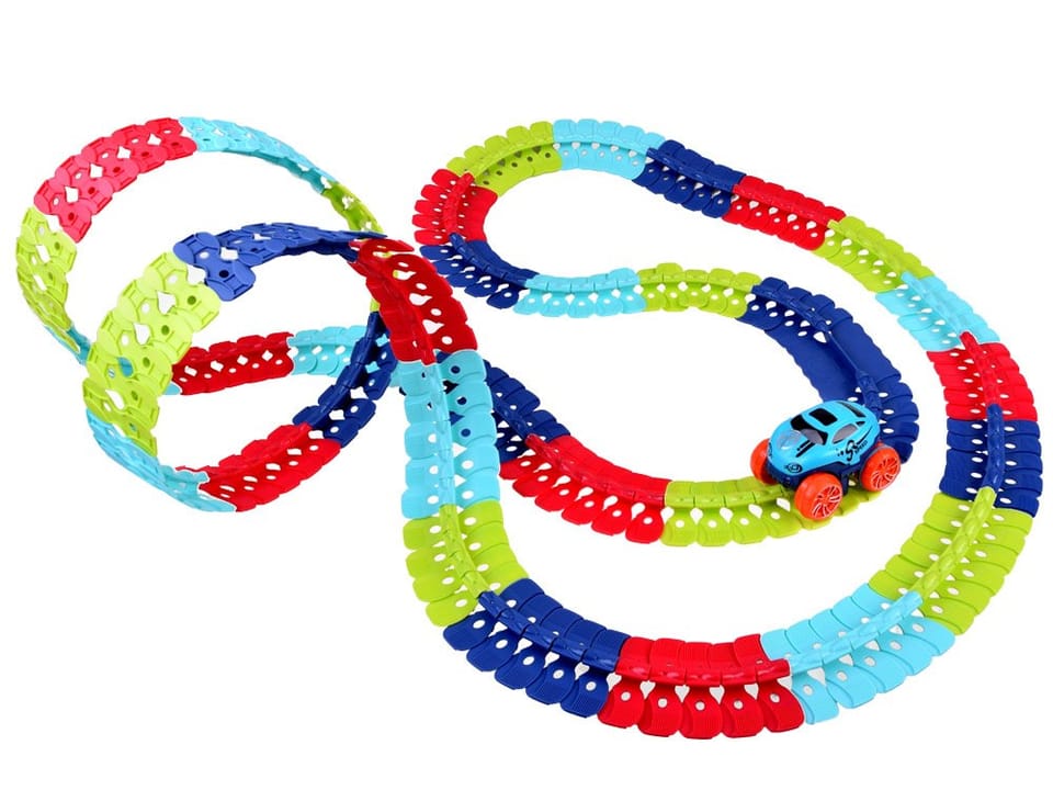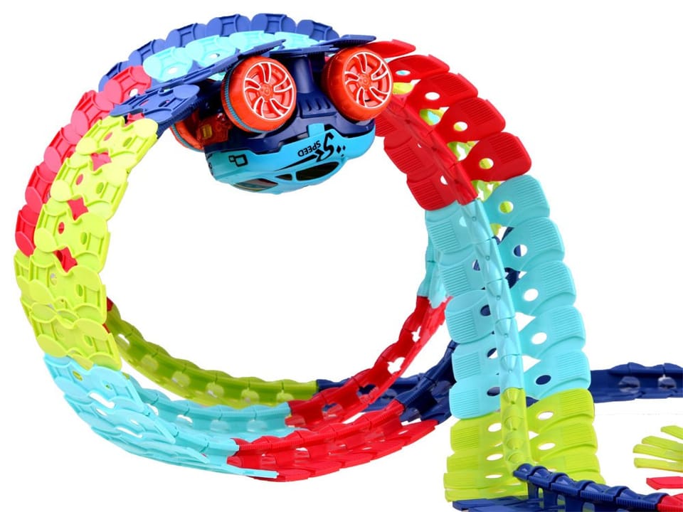 W zestawie znajdują się aż 184 elementy pozwalające na zbudowanie toru o maksymalnej długości aż 440 cm! Dzięki nietypowemu kształtowi łączników, tor można dowolnie zmieniać, skręcać, tworzyć zakręty. Wykorzystując dziecięce krzesełka, książki czy pudełka można stworzyć prawdziwy tor przeszkód, pełen podjazdów i stromych zjazdów. Po ułożeniu toru, pośrodku powstaje prowadnica, zapobiegająca wypadnięciu autka z toru.