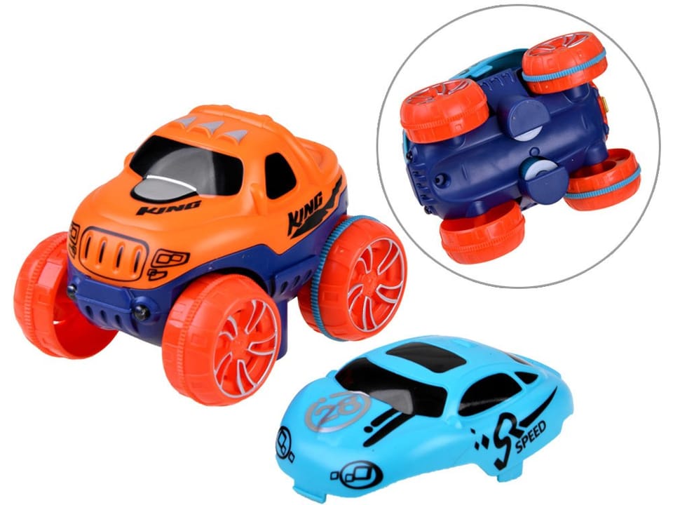 Masywne autko wykonane jest z wysokiej jakości tworzywa sztucznego. Tylne koła dodatkowo posiadają gumowe opaski, poprawiające przyczepność. Do wyboru mamy nadwozia w dwóch kolorach- pomarańczowym i turkusowym. Po zamontowaniu baterii 3 x AAA (brak w zestawie) autko samodzielnie może pokonywać przygotowaną trasę. Wystarczy umieścić samochodzik na starcie (element z napisem GO) i uruchomić przyciskiem umieszczonym w tylnej lampie autka. Samochodzik natychmiast pomknie przed siebie z zawrotną prędkością. Podczas jazdy w autku świecą światła z tyłu- na czerwono, z przodu natomiast na zielono.