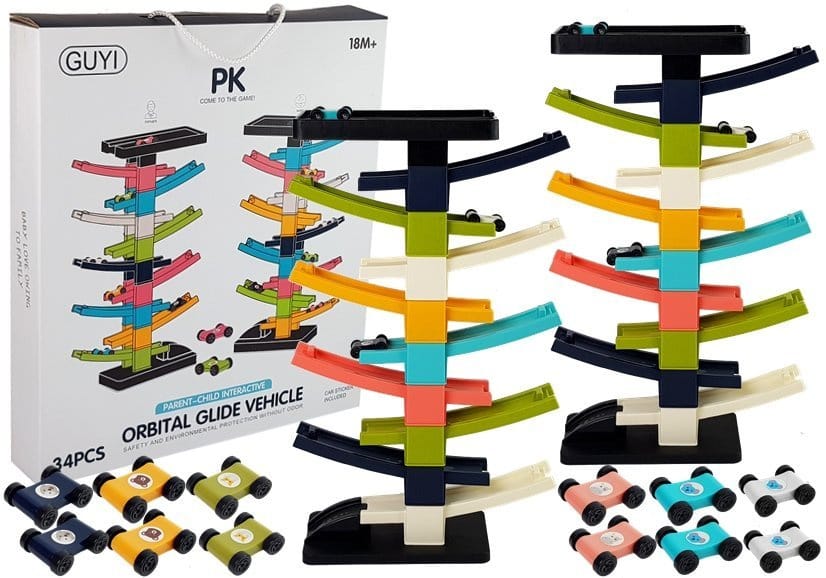Zjeżdżalnia jest różnokolorowa i do tego posiada 10 pięter, wystarczy położyć autko na szczycie zjeżdżalni i podziwiać jak ślizga się, aż na sam dół. Można urządzić też rywalizację z tatą. Kogo pierwsze autko będzie na dole? Kto wygra?