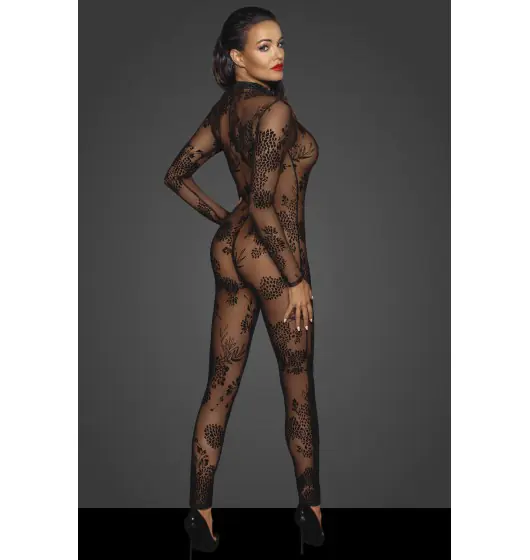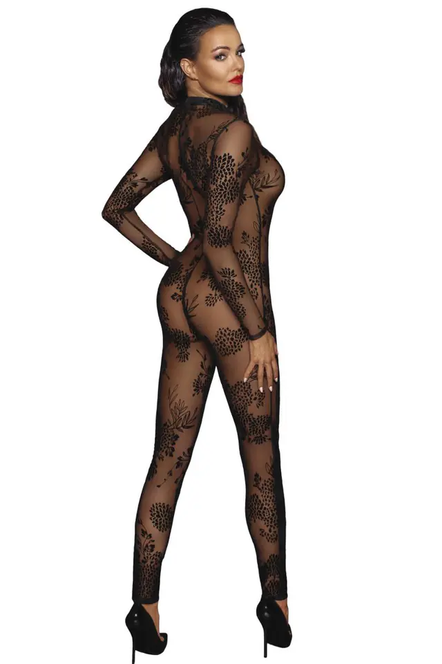 Przezroczysty kombinezon z długim rękawem i długimi nogawkami marki Noir Handmade. Wykonany w całości z elastycznej, miękkiej siateczki i flokowany delikatnym aksamitnym nadrukiem. Dopasowuje się do ciała jak druga skóra! Praktyczny i jednocześnie bardzo erotyczny jest 3-stronny zamek błyskawiczny, który biegnie od szyi do krocza.
