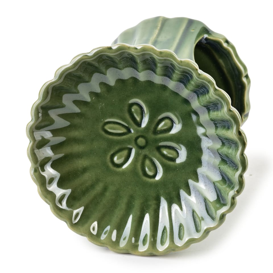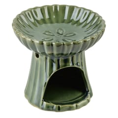 Ceramiczny zielony kominek na olejek zapachowy o wymiarach 10,5x8,5cm i wysokości 9,5 cm to elegancki, kompaktowy dodatek, który wprowadza do wnętrza ciepło i relaksującą atmosferę. Wykonany z wysokiej jakości ceramiki, łączy w sobie praktyczność z estetyką, czyniąc go idealnym elementem wyposażenia dla miłośników aromaterapii.Kominek charakteryzuje się niewielkim, minimalistycznym kształtem, dzięki czemu z łatwością dopasuje się do każdego wnętrza, niezależnie od stylu, od nowoczesnych aranżacji po bardziej klasyczne czy boho. Jego górna część służy jako miseczka na wodę z dodatkiem olejku zapachowego, a dolna przestrzeń umożliwia umieszczenie tealighta, który delikatnym płomieniem podgrzewa mieszankę, uwalniając przyjemny aromat. wymiary:10,5x8,5x9,5cm waga: 300gzapakowany w jednostkowy box