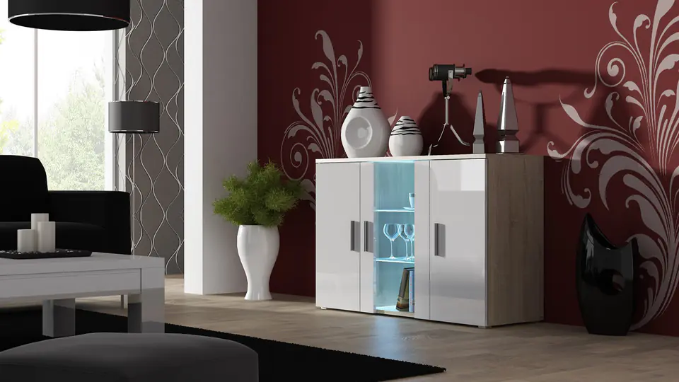 | Dodatkowe informacje: | Dostępne kolory podświetlenia: biały zimny, czerwony, niebieski, zielony, Zdjęcia zestawów przedstawiają przykładową aranżację z innymi meblami z kolekcji. Pozostałe bryły są dostępne w osobnej sprzedaży., Istnieje możliwość dokupienia oświetlenia szafkowego LED., Meble do samodzielnego montażu, Płyta wiórowa laminowana wyróżnia się odpornością na naprężenia mechaniczne i ekstremalne temperatury, Z lewej i prawej strony drzwi z frontami w wysokim połysku, wewnątrz po jednej półce, Opcjonalne oświetlenie LED półek (za dopłatą), Na środku jeden front ze szkłem, wewnątrz dwie półki szklane z opcjonalnym oświetleniem LED |
