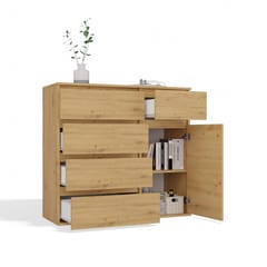 - Funkcjonalne wnętrze – 1 drzwi, 2 zamknięte półki i 5 pojemnych szuflad ułatwiają organizację i przechowywanie.