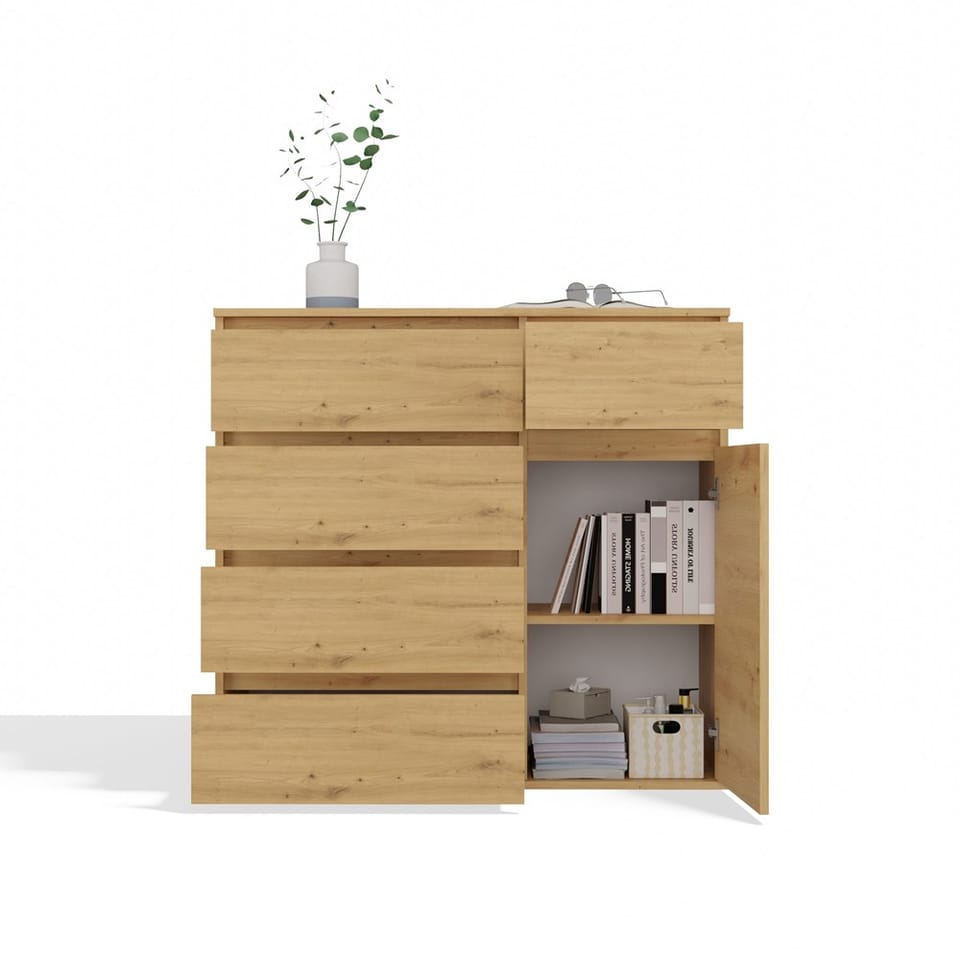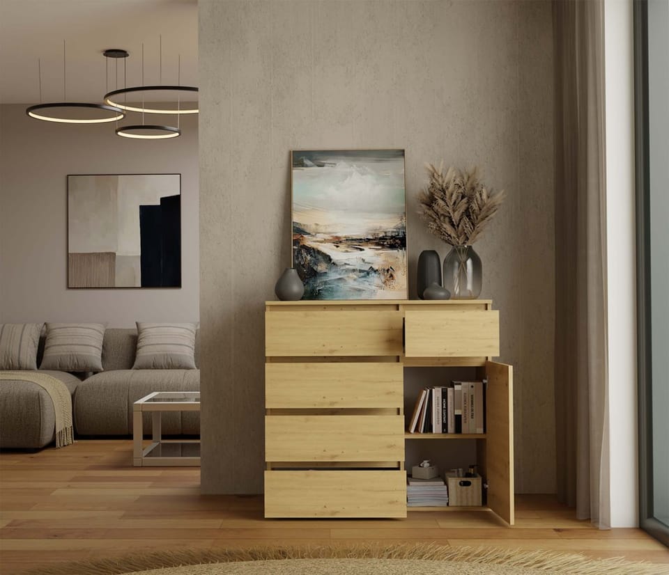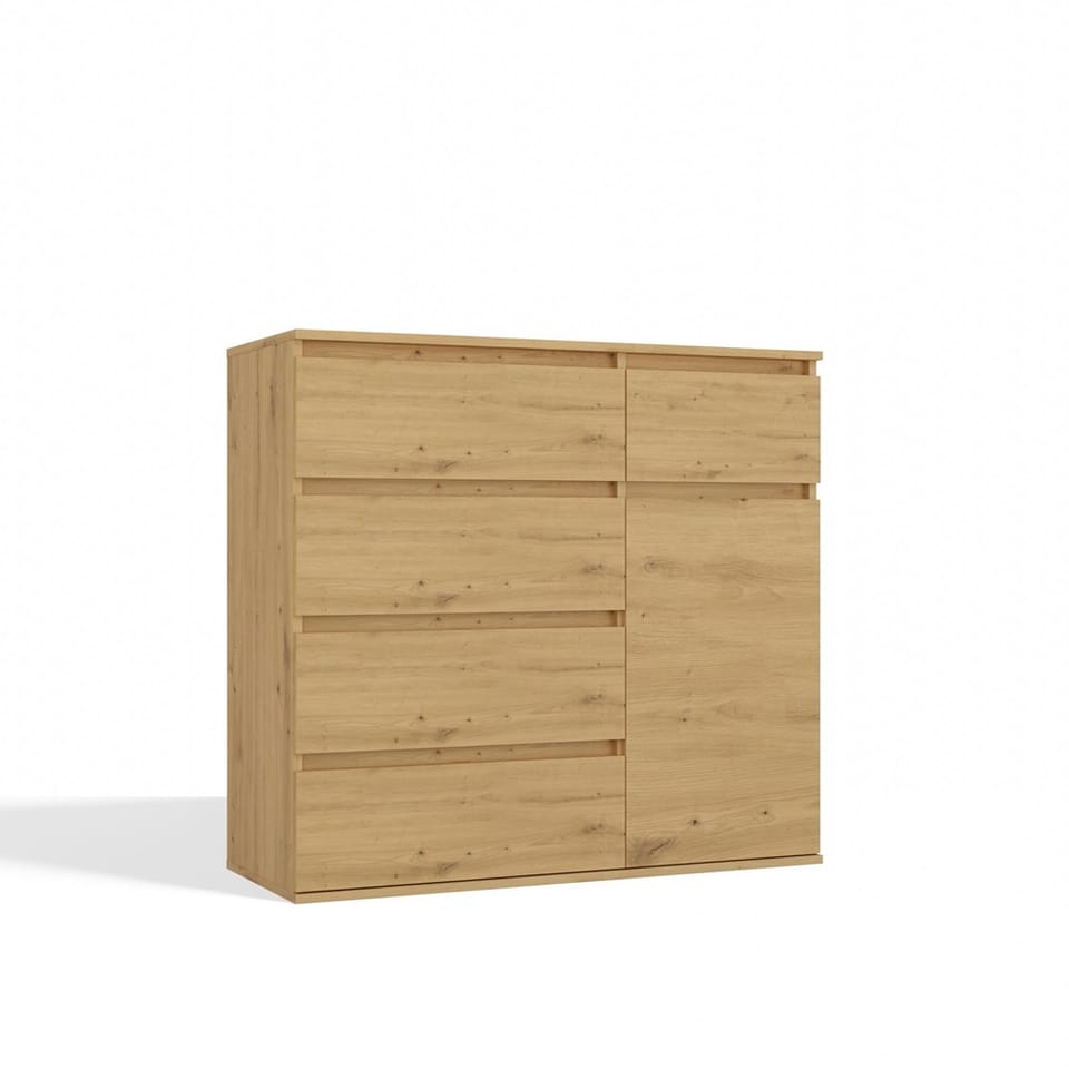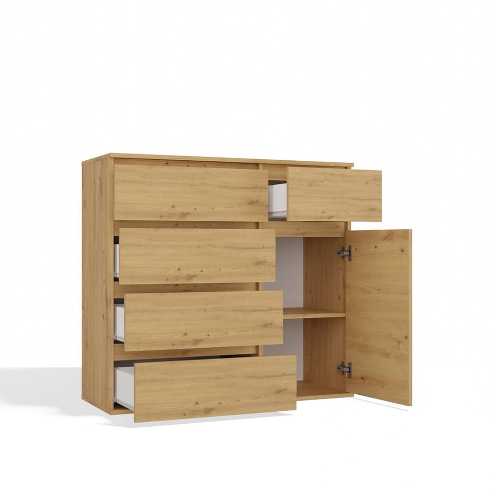 Komoda 1D5S to elegancki i funkcjonalny mebel, który doskonale sprawdzi się w sypialni, salonie, przedpokoju lub pokoju dziecka. Przemyślany układ jednych drzwiczek oraz pięciu pojemnych szuflad umożliwia wygodne przechowywanie ubrań, dokumentów, akcesoriów czy innych przedmiotów codziennego użytku, pomagając utrzymać porządek w pomieszczeniu. GŁÓWNE CECHY MEBLA: