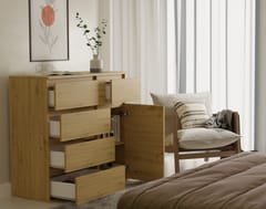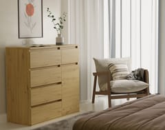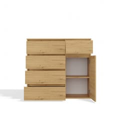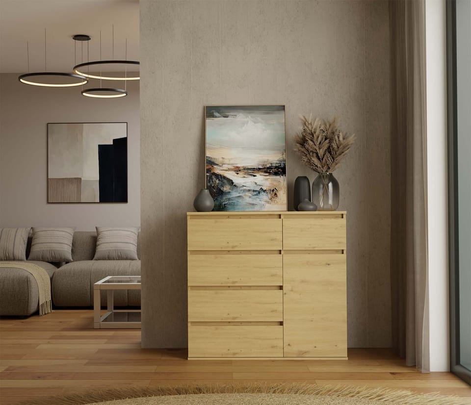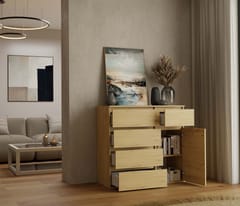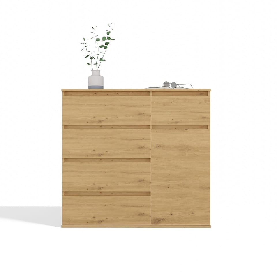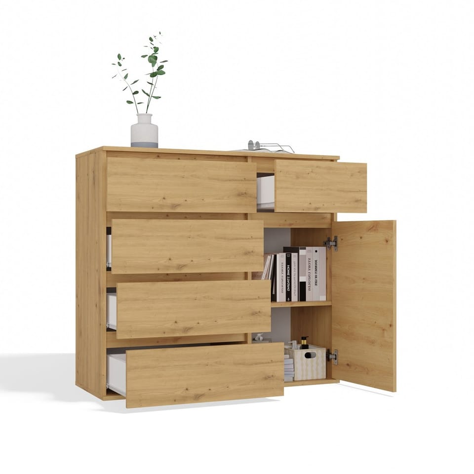 Komoda 1D5S to elegancki i funkcjonalny mebel, który doskonale sprawdzi się w sypialni, salonie, przedpokoju lub pokoju dziecka. Przemyślany układ jednych drzwiczek oraz pięciu pojemnych szuflad umożliwia wygodne przechowywanie ubrań, dokumentów, akcesoriów czy innych przedmiotów codziennego użytku, pomagając utrzymać porządek w pomieszczeniu. GŁÓWNE CECHY MEBLA: