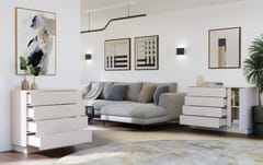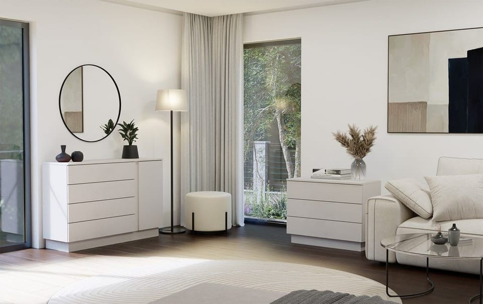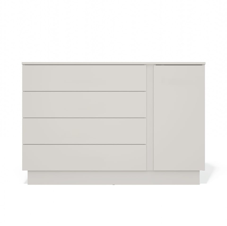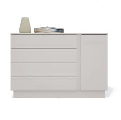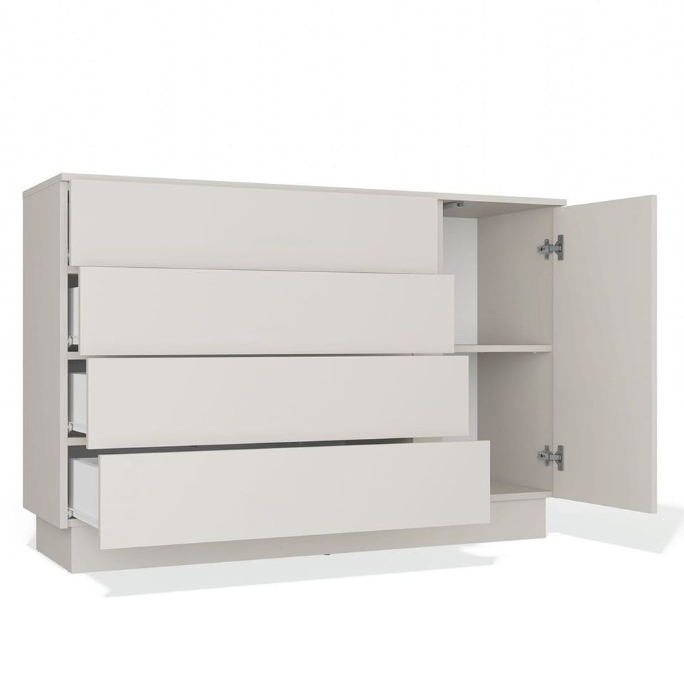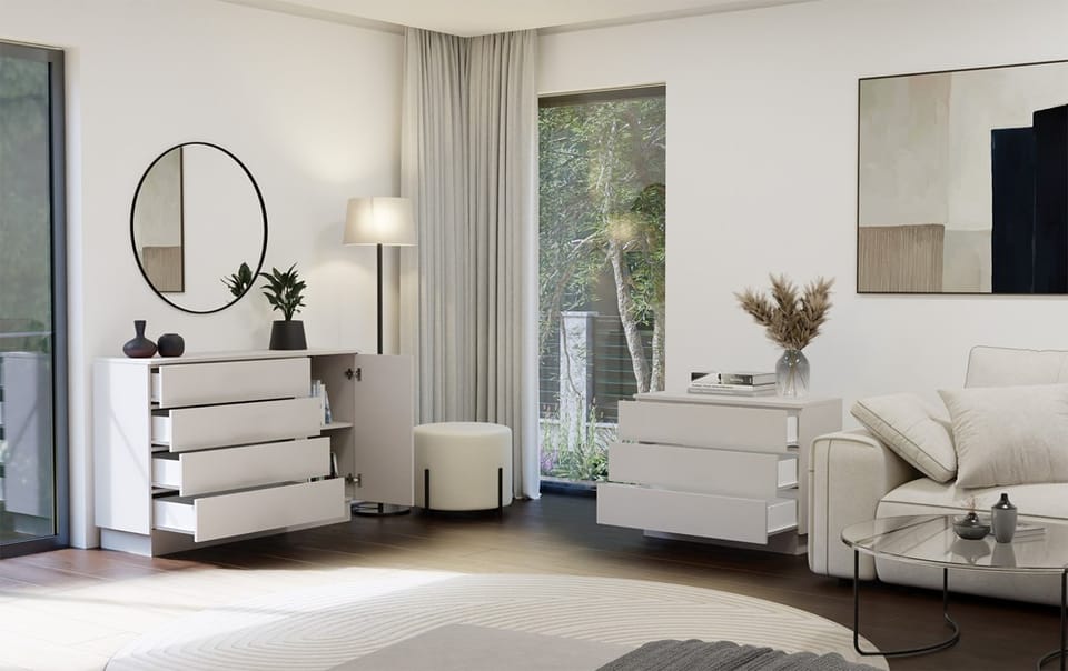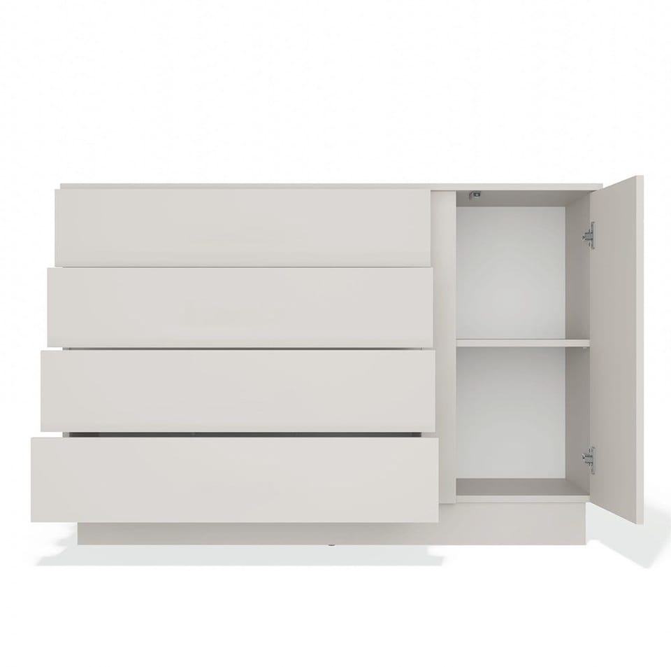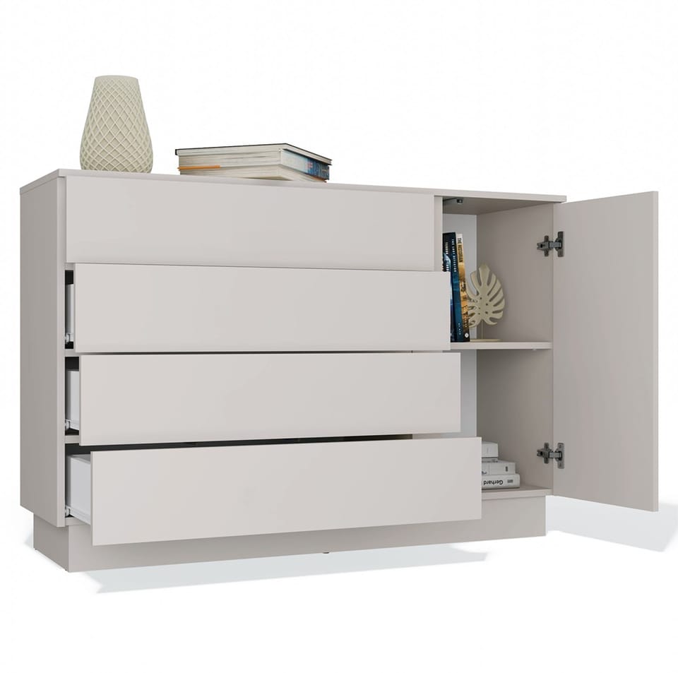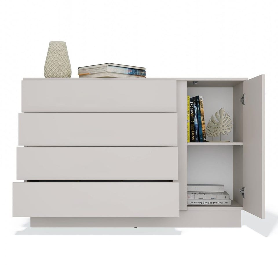 Nowoczesna komoda AMBER 1D4S to połączenie minimalistycznego stylu z funkcjonalnością, które sprawdzi się zarówno w salonie, sypialni, jak i przedpokoju. Dzięki kompaktowym wymiarom i uniwersalnej kolorystyce, wpasuje się w niemal każdą przestrzeń. Mebel wyposażony został w 4 pojemne szuflady osadzone na prowadnicach rolkowych oraz jedną ukrytą za drzwiami szafkę z półką, która umożliwiają wygodne przechowywanie dokumentów, ubrań, dodatków lub innych domowych drobiazgów.