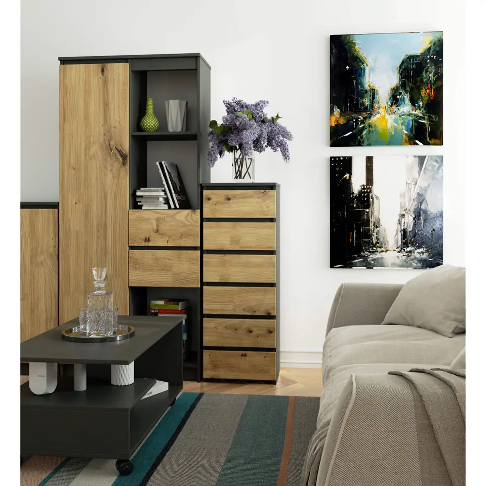 - elegancki wygląd - komoda jest prosta w formie, cechuje się stylowym kolorem grafit szary dąb artisan,