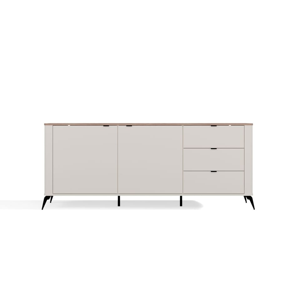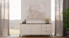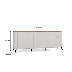 Komoda CORDOBA 2D3S z nowoczesnej kolekcji Cordoba łączy elegancję z funkcjonalnością. Wykończona w modnym kolorze kaszmiru z kontrastującym blatem w dekorze Dąb Castello, idealnie wpasuje się w nowoczesne, skandynawskie i klasyczne wnętrza. Jej atutem są zaokrąglone boki, które podkreślają stylowy charakter mebla i dodają mu lekkości.