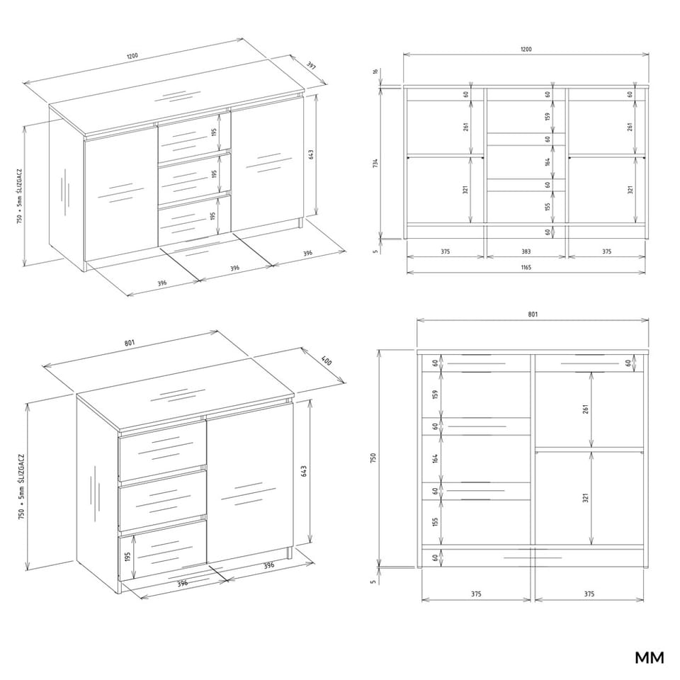Wnętrze komody składa się z półek oraz szuflad, które pomogą przy rozmieszczaniu rzeczy. Łatwiej będzie znaleźć to, czego się szuka.