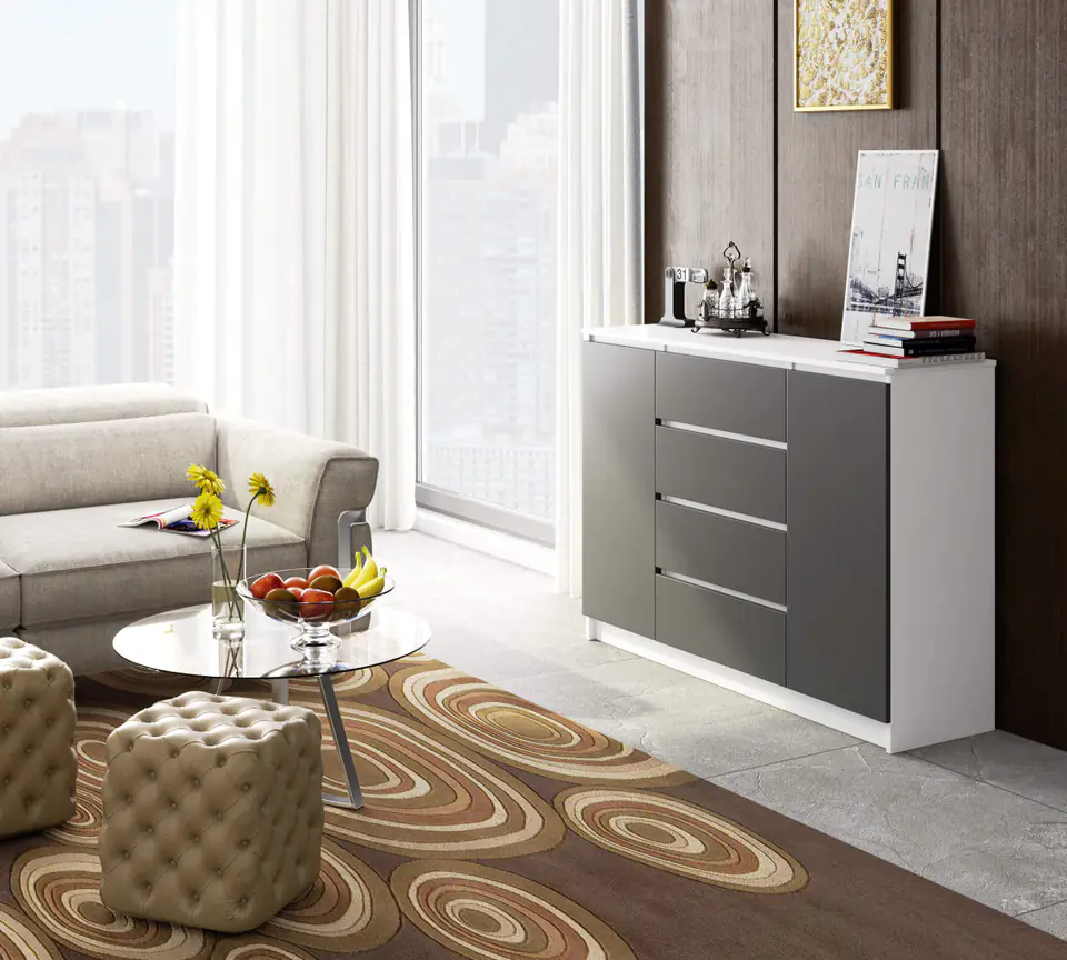 - Komoda wykonana z wysokogatunkowej płyty laminowanej 16mm odpornej na ścieranie, producent kronospan- Fronty szuflad wykonane z płyty laminowanej- Szuflady poruszają się na metalowych prowadnicach rolkowych